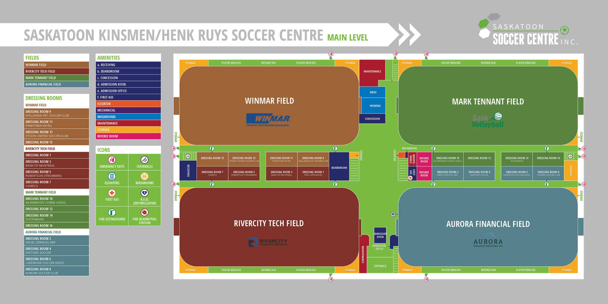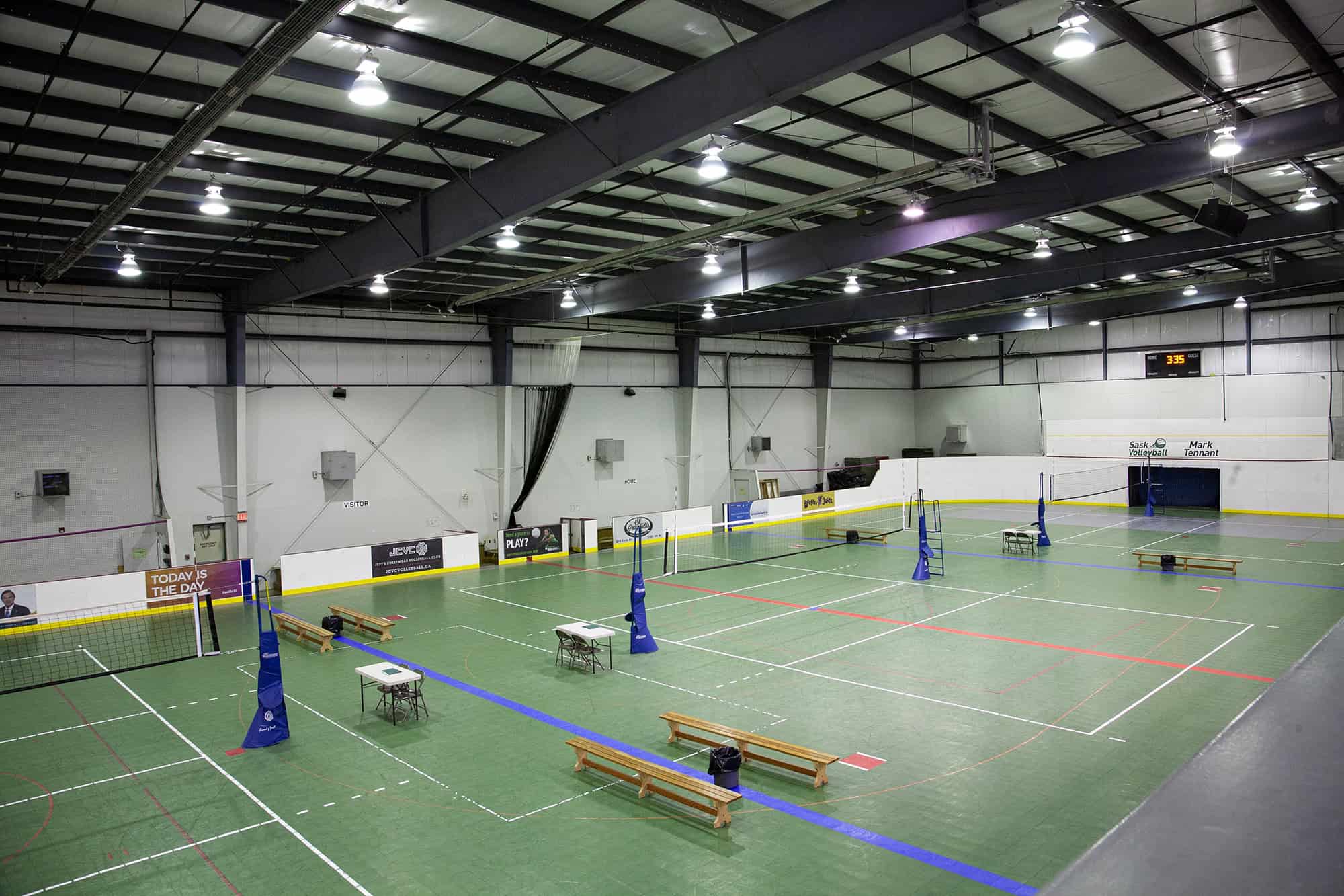 The original indoor Soccer Centre in Lawson Heights is 97,000 sq. ft. with four smooth-floor boarded fields. Recent upgrades to sprung floors enhance performance and greatly reduce injuries, thereby taking the best interests of all athletes to heart. Upper level spectator viewing areas include bleacher seating & access to the full-service, all ages NorthRidge Lounge. The facility also offers community programs such as Indoor Playgroup, Pickleball and Indoor Walking. The Saskatoon Kinsmen/Henk Ruys Soccer Centre offers:
